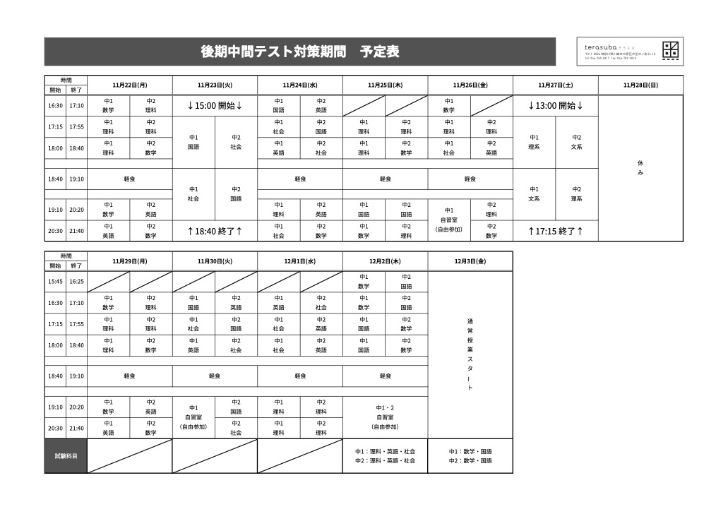 井田中の1・2年生はいよいよ来週がテスト。後期中間テストまで残り1週間となりました。テラスバ元住吉ではテスト対策も佳境に入り,授業数がさらに増加。20時間以上増えます。最後の仕上げです。学校ワークの事前チェック期限も迫ってます。終わらない場合,日曜日も強制自習になっちゃいます笑あと1週間!みんな,頑張りましょう!